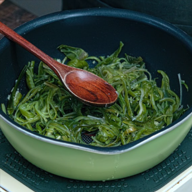 물기를 꽉 짜는 것은 미역줄기볶음 만드는법에서 식감을 결정짓는 중요한 요소입니다. 물기가 너무 많으면 볶을 때 기름과 겉돌아 질척해질 수 있습니다. 물기를 짠 후에는 5~6cm 길이로 썰어주세요. 너무 길면 먹기 불편하고 너무 짧으면 식감이 떨어지므로 젓가락으로 집기 편한 길이가 가장 좋습니다.