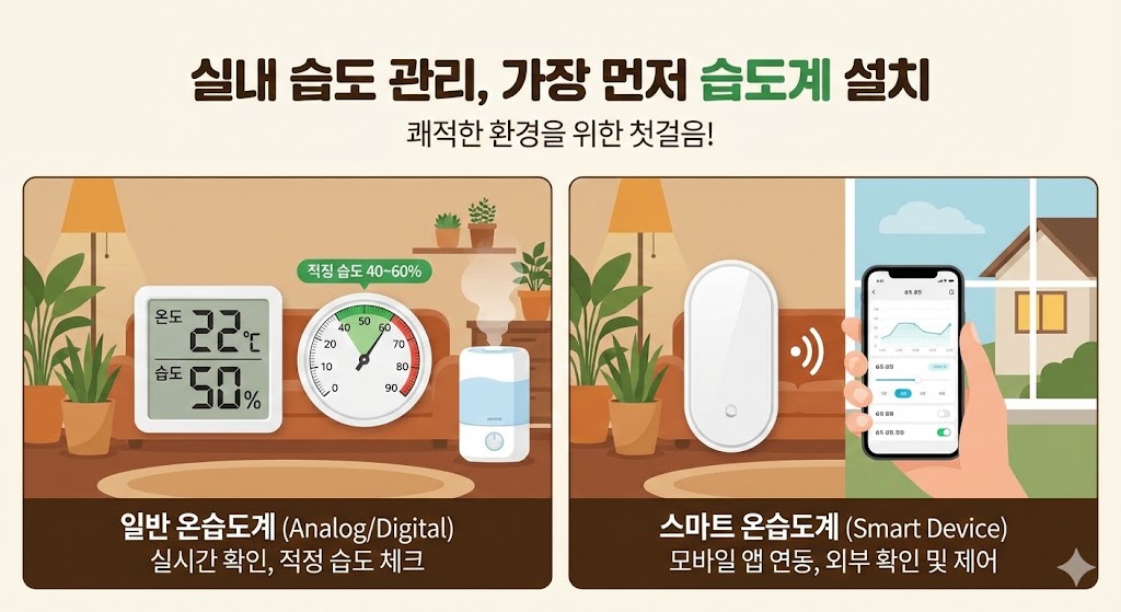 실내 습도 관리를 위해 가장 먼저 해야 할 일은 습도계 설치입니다. 온습도계를 사용하면 실시간으로 실내 환경을 확인할 수 있으며, 적정 습도 범위에 따라 적절한 대응이 가능합니다.