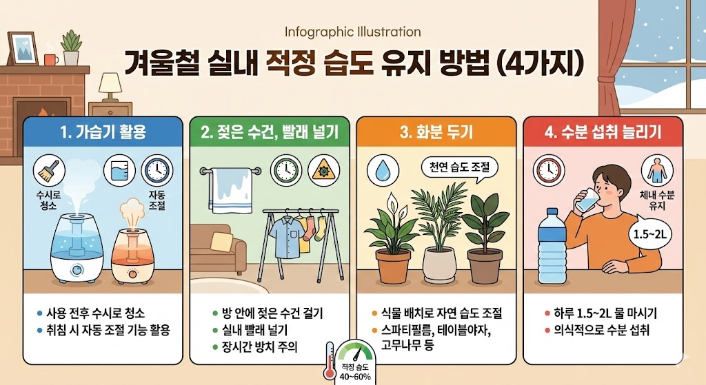 습도 조절과 별개로 체내 수분 유지도 중요합니다. 겨울철에는 갈증을 느끼기 어려워 물을 덜 마시는 경향이 있지만, 의식적으로 하루 1.5~2리터 정도의 수분을 섭취하는 것이 건강에 도움이 됩니다.
