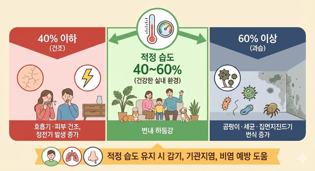 - 40% 이하: 호흡기, 피부 건조, 정전기 발생 가능성 증가