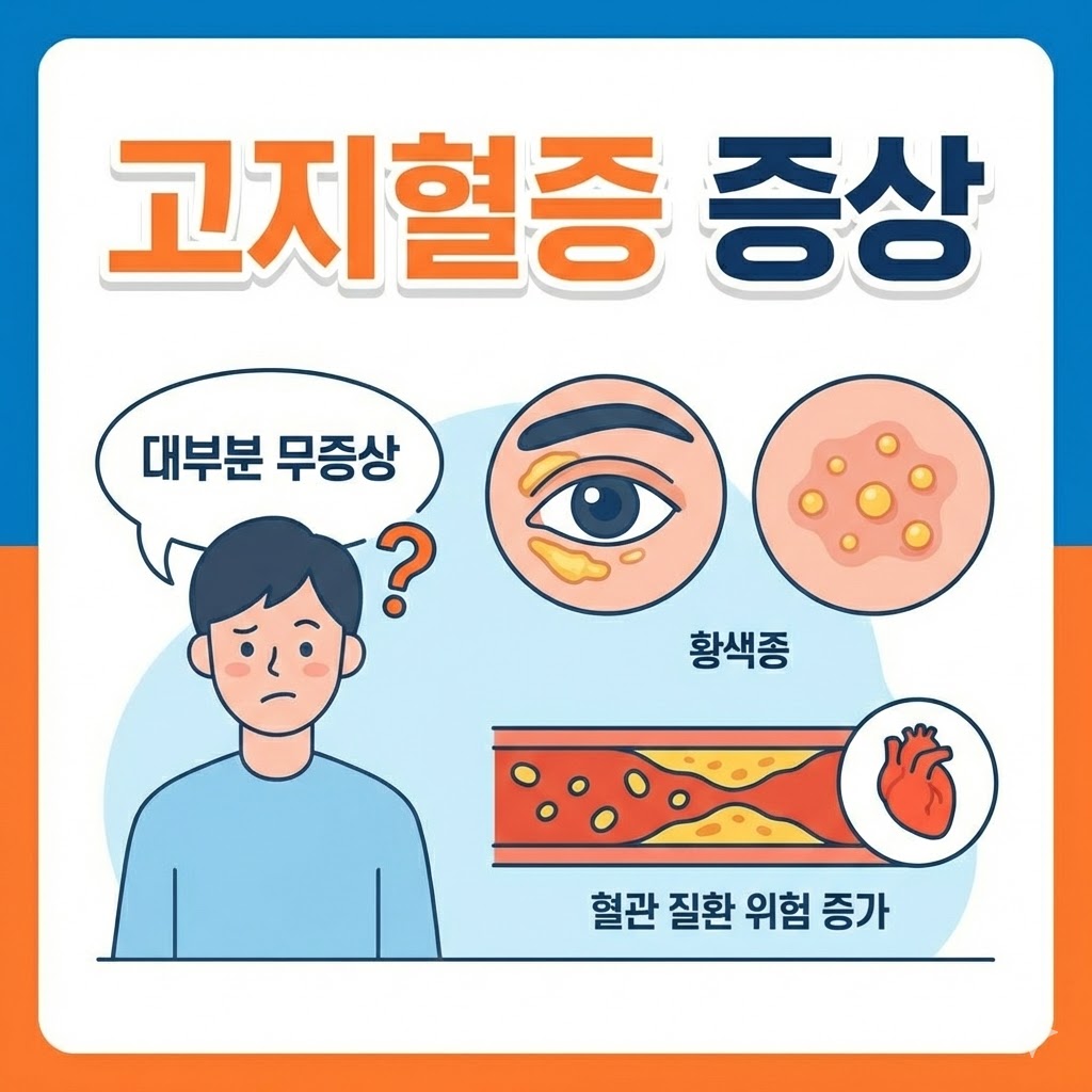 혈중 콜레스테롤 수치가 극도로 높아지면 지방 성분이 피부에 침착되기도 합니다. 대표적인 외관상 고지혈증 증상으로는 눈꺼풀 안쪽에 노란색 점처럼 생기는 '황색종'이 있습니다. 또한 아킬레스건이나 무릎, 팔꿈치 등에 혹처럼 지방이 뭉쳐 나타날 수 있는데, 이런 변화가 보인다면 즉시 수치를 확인해야 합니다.