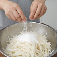 시간이 지나도 물이 흥건해지지 않는 무생채 맛있게 하는법의 노하우는 '선 절임'에 있습니다. 채 썬 무에 소금과 설탕을 조금 넣어 10~15분간 절여보세요. 이때 나온 수분을 가볍게 짜내고 무쳐야 간이 쏙 배어들고 끝까지 꼬들꼬들한 식감을 즐길 수 있습니다. 설탕에 먼저 절이면 무의 매운맛을 잡는 데도 효과적입니다.
