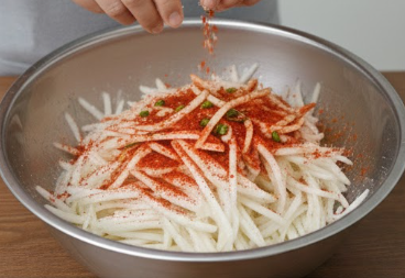 비주얼까지 완벽한 무생채 맛있게 하는법을 원한다면 고춧가루를 먼저 활용하세요. 다른 양념을 넣기 전, 고춧가루만 먼저 넣고 무를 버무려 '색'을 입히는 과정이 필요합니다. 이렇게 하면 무 표면에 붉은색이 예쁘게 물들고 고춧가루가 무의 남은 수분을 흡수해 양념이 겉도는 것을 방지해 줍니다.