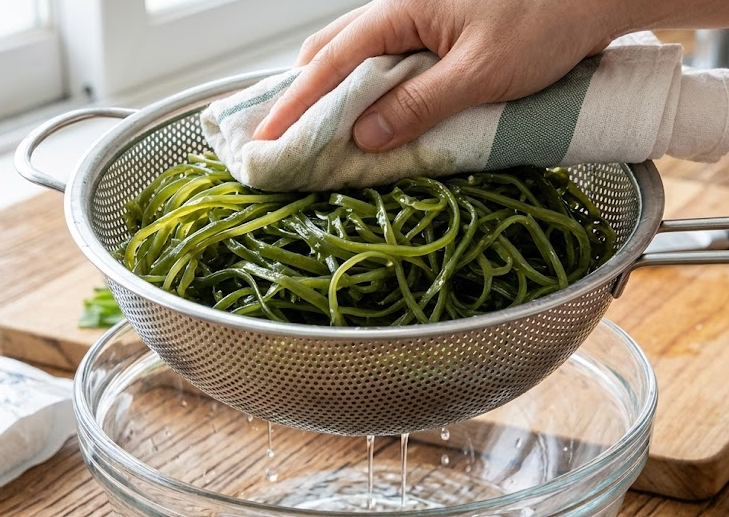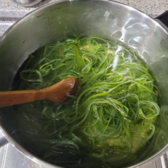 물기를 꽉 짜는 것은 미역줄기볶음 만드는법에서 식감을 결정짓는 중요한 요소입니다. 물기가 너무 많으면 볶을 때 기름과 겉돌아 질척해질 수 있습니다. 물기를 짠 후에는 5~6cm 길이로 썰어주세요. 너무 길면 먹기 불편하고 너무 짧으면 식감이 떨어지므로 젓가락으로 집기 편한 길이가 가장 좋습니다.