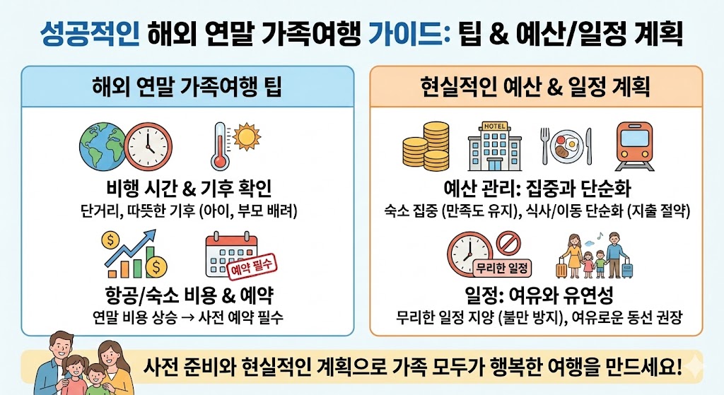 연말 여행은 예산 관리가 중요합니다. 숙소에 비용을 집중하고, 식사와 이동은 단순화하면 만족도를 유지하면서 지출을 줄일 수 있습니다. 가족여행일수록 무리한 일정은 오히려 불만을 만들 수 있습니다.