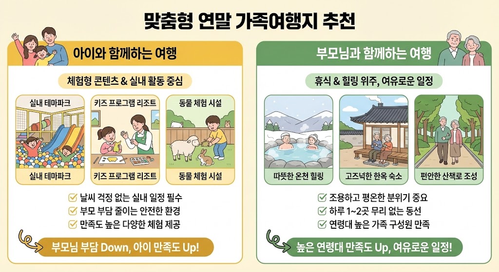 연말 가족여행지 추천은 화려한 관광지보다 가족 모두가 편안하게 머물 수 있는 장소를 고르는 것이 핵심입니다. 이동 거리, 숙소 환경, 구성원 연령대를 고려해 계획한다면 연말이라는 특별한 시기에 오래 기억에 남는 여행을 만들 수 있습니다.