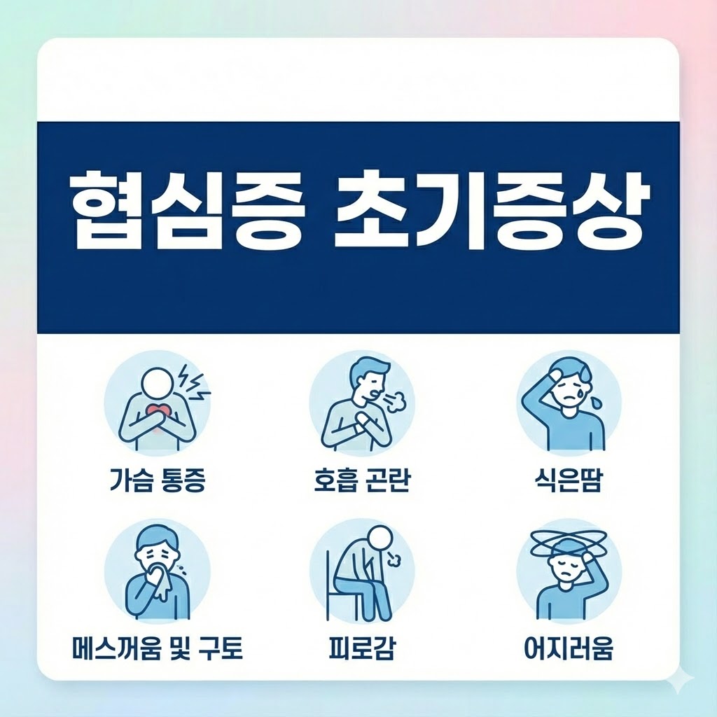 갑자기 가슴이 꽉 조이는 듯한 통증이 느껴지면 덜컥 겁이 나기 마련입니다. 심장 근육에 혈액이 충분히 공급되지 않아 발생하는 협심증은 방치할 경우 심근경색이라는 치명적인 결과로 이어질 수 있는데요. 전조 증상을 미리 알고 대처하는 것이 무엇보다 중요합니다. 오늘은 생명과 직결되는 협심증 초기증상 6가지를 상세히 정리해 드립니다.